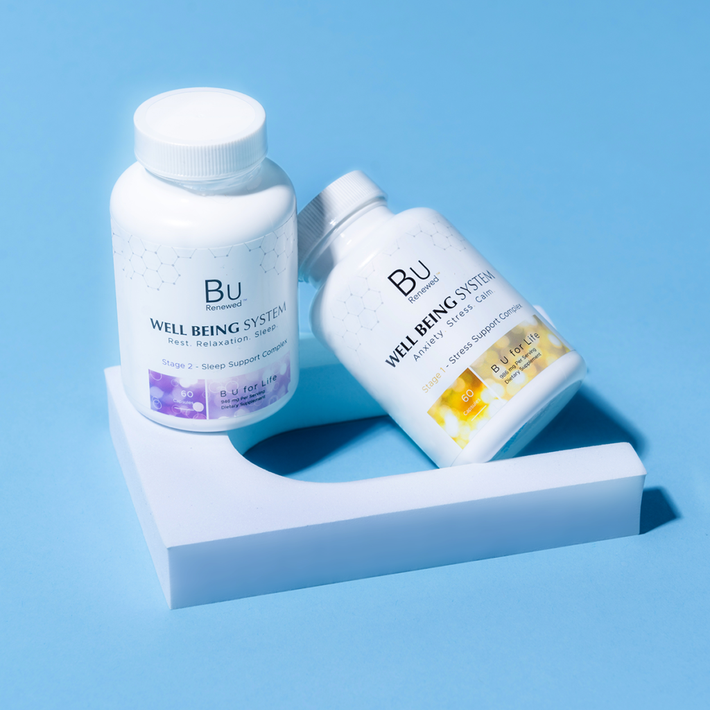 Formulated with clinically studied ingredients like ashwagandha and GABA, the Bu Renewed Well Being System supports anxiety relief without sedation.